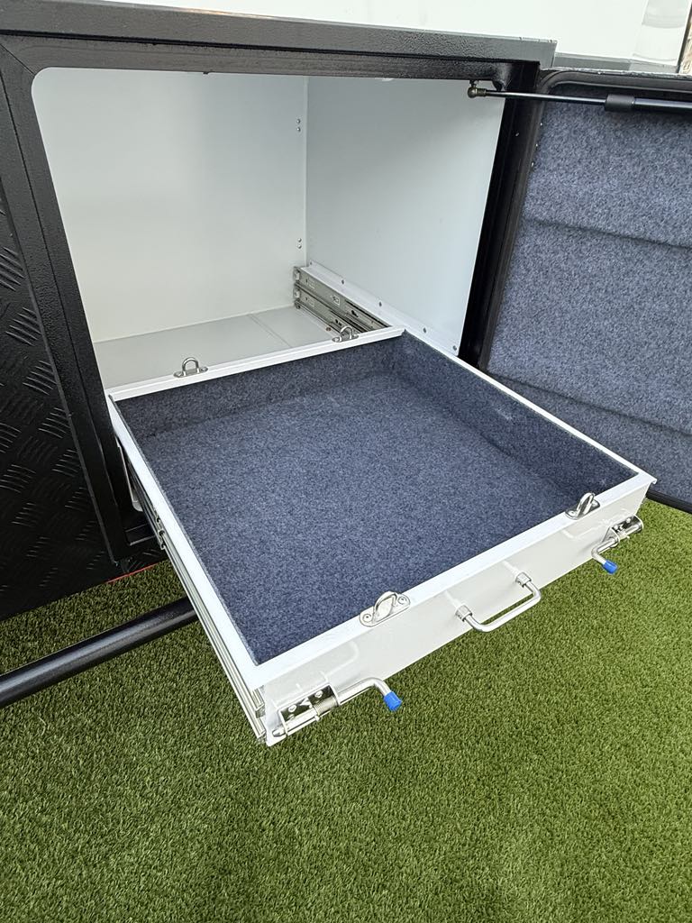 Slide out stainless-steel deluxe kitchen with AGA 4 burner stove, multiple storage compartments, internal fridge with an option of an internal induction cooker.