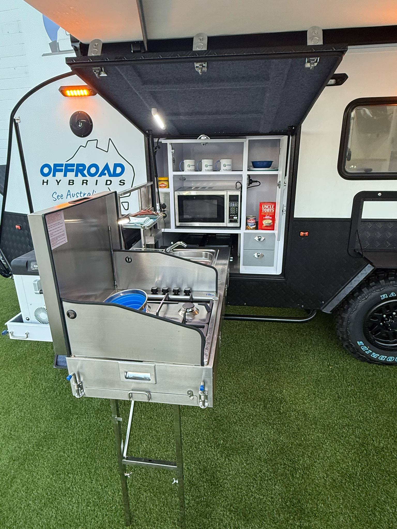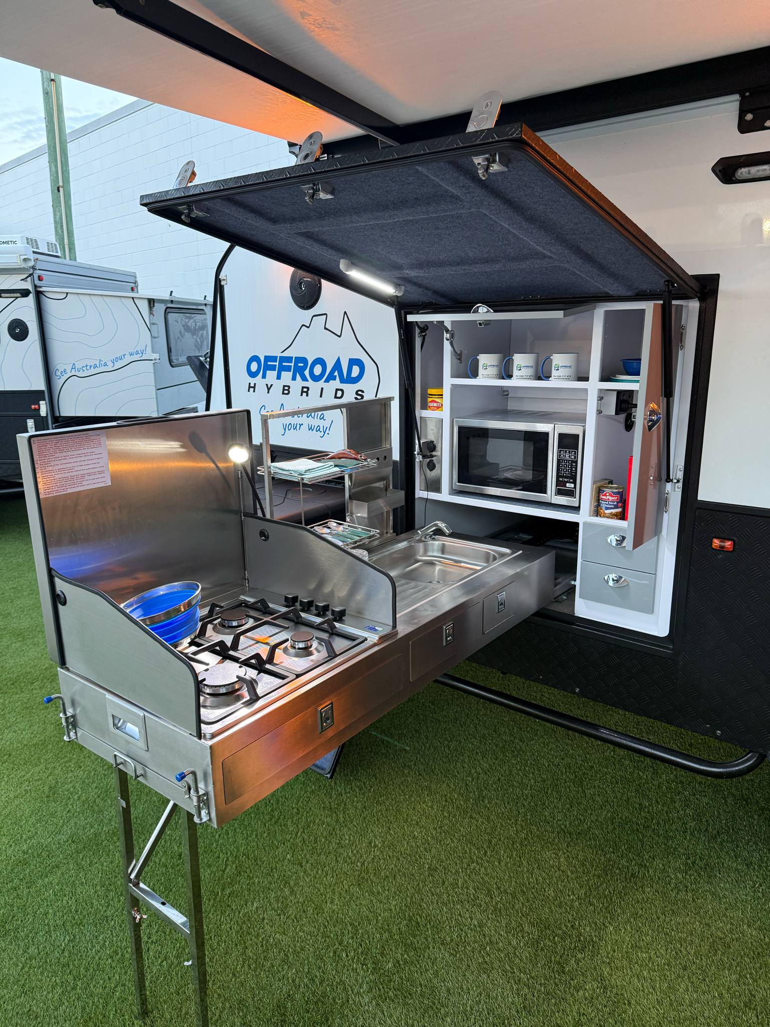- External slide out stainless steel deluxe kitchen with microwave oven and plumbed hot & cold water