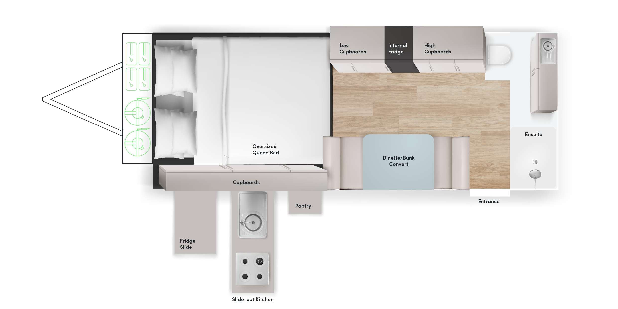- Internal fridge with option of internal induction cooktop